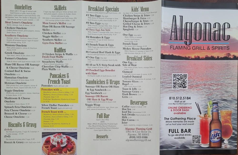 Welcome to Algonac Flaming Grill, your go-to destination for delicious American cuisine in a relaxed atmosphere. Located at 1065 St Clair River Dr, we offer an extensive menu featuring mouthwatering breakfasts, lunches, and dinners, complemented by a great selection of beers and wines. Enjoy our local specialties or indulge in our tempting desserts. With quick service, takeout, and delivery options, we cater to every need. Our restaurant is wheelchair accessible and perfect for groups and solo diners alike. Come savor the flavors and experience the friendly ambiance at Algonac Flaming Grill today!